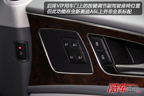 中大型车讲究后排为尊,能调节副驾驶座椅的“老板按键”自然不应该缺少。不过在新A6L上这项功能只有高配车型才有,让人有些不太理解,毕竟现在很多中级车都在普及这项功能。对于有专职司机的后排车主,用到这项功能的机会其实并不多(专职司机一般都会提前设定好),但对于讲究身份地位和排场的车主,心理上的影响因素还是有的。