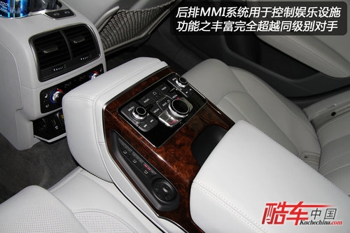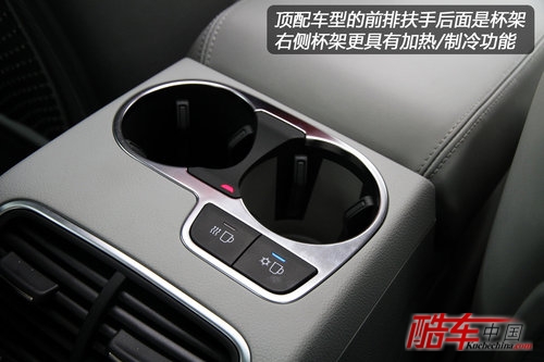 前排延长的中央扶手箱为后排乘客准备了两个杯架,其中右侧杯架能实现加热/降温功能,它的加热/降温功能是独立运作的,并不受空调系统运作的影响。不过独立运作的杯架降温功能在工作时,会发出类似风扇运转的嗡嗡声,大概是新A6L的隔音效果好,车内轻微的声音都会被察觉。其实也不必担心,新A6L配备的BOSE音响效果绝对是一流水准,因此车厢内依然是极高水准的听觉享受。