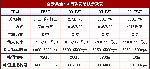 动力/驾乘感受新奥迪A6L依然是四款动力配置,其中30FSI的2.5L V6 FSI发动机为全新机型,专门为中国市场打造。它将取代老款A6L上那台略显老态的2.4L发动机。其余的三款机型亦有所变动,除了2.8FSI以外,2.0TFSI和3.0TFSI的参数均有所提升,另外新A6L全系搭载带有能量回收的发动机自动启停以及智能热管理系统,在燃油消耗方面全面提升。