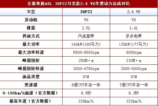 这台2.5L发动机实际上是2.8L FSI发动机的衍生品,缩小排量使之在税费标准上更具优势。另外根据上一代A6L的销量分布,2.4L V6所占比例最高,因此我们认为全新的2.5L V6发动机仍有可能充当奥迪A6L最叫座的产品,排量增加0.1L,增加直喷技术后,这台发动机相比2.4L老款机型到底有多少提升呢?