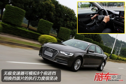 比较有意思的是,我们试驾的这台30FSI车型还装备有换挡拨片,虽然Mutitronic无级变速器的本意是提升效率和平顺度,驾驶乐趣并非这种变速器的主旨,但进入手动模式后,发现变速器模拟8个档位的换挡动作还真有点传统变速器的感觉,尤其是用拨片强制降档,变速器执行的力度也颇为坚决,能直接降档到接近红区,发动机辅助制动效果也够明显,虽然加速力道并不会因为手动模式有所改善,但得承认这套换挡拨片并非花瓶,在需要手动介入时它工作称职,但还是那句话,别指望在30FSI车型上获得感官刺激。