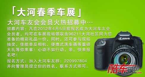 招募内容:凡在2012年4月5日前报名成为大河车友会会员者,均可在车展现场领取由96211大河社区网为您准备的精彩礼品一份,同时,还可参与现场抽奖,佳能单反相机、便携式洗车器等重磅大礼等你来拿!心动不如行动,亲,快来报名吧!