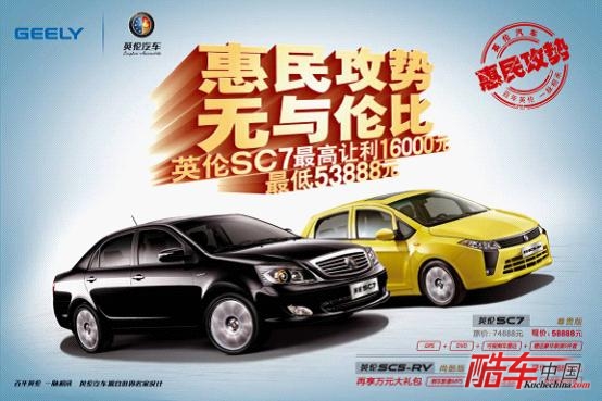 英伦SC7系 外观大气棱角分明,拥有良好的空间,配备电动天窗、真皮多功能方向盘、行车电脑显示屏等实用的配置。活动期间购部分车型,可享16000现金优惠,有兴趣的朋友可到店了解详情。