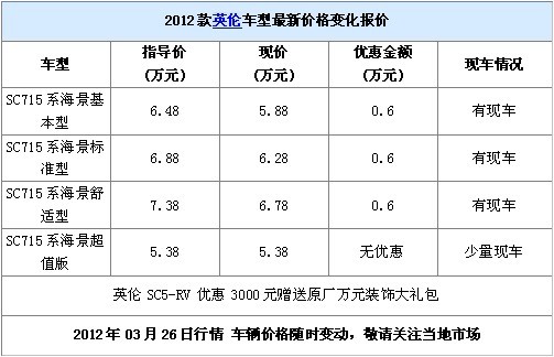 近日,编辑从河南云阳海汽车销售有限公司英伦4S店了解到,英伦SC7系最高优惠16000元,最低53888元起,详情可咨询店内销售人员。