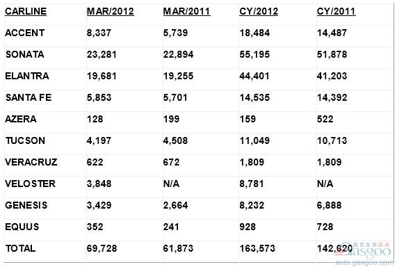 3月份,索纳塔在美销量最高,为23,281辆,同比增长1.7%,去年同期的销量为22,894辆;伊兰特销量为19,681辆,同比增长2.2%,去年同期的销量为19,255辆;Accent的销量为8,337辆,同比增长45%,去年同期的销量为5,739辆。