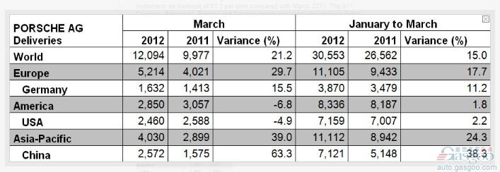 3月份保时捷在欧洲的销量为5,214辆,同比增长29.7%,其中在德国的销量为1,632辆,同比增长15.5%;在美国的销量为2,460辆,同比下降4.9%;在亚太区的销量为4,030辆,同比增长39.0%,其中在中国的销量为2,572辆,同比增长63.3%。