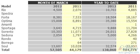 起亚汽车公司日前公布,其今年3月份在美国市场的销量首破5万辆达到57,505辆,同比增长30.2%,去年同期的销量为44,179辆。