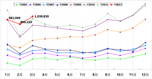 2005—2012年乘用车(轿车/MPV/SUV)月销量走势图