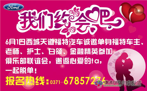 6月1日西城天道诚约单身福特车主、老师、护士、白领、金融精英等参加“联谊会”,相聚西城天道,寻找心中的她或他。西城天道特为单身人士组织了一场别具格调的相亲派对。丰富的互动活动,靠谱的单身精英,你的一见钟情或许就在这里!届时到店品红酒、玩游戏、领礼品、看电影……还等什么,赶快报名,一起脱单吧!
