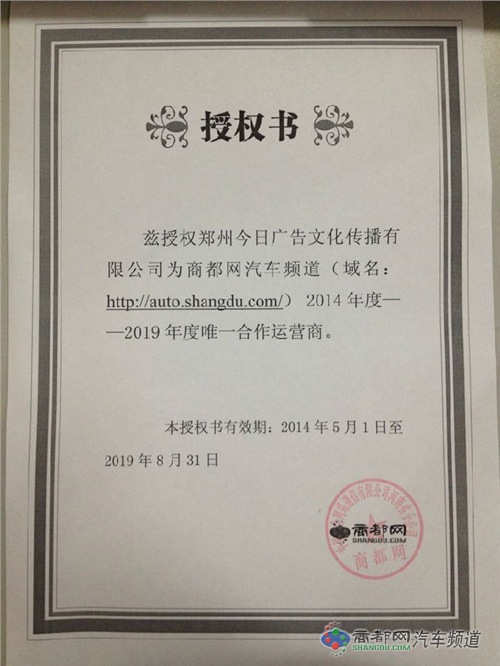 商都网汽车频道是商都网核心重点频道,上线十几年来一直使用:“商都网汽车频道”、“商都汽车”等网站频道名称。郑州今日广告文化传播有限公司是商都网汽车频道(auto.shangdu.com)2014年5月1日到2019年8月31日期间唯一合法运营单位,已签署正式合同,除郑州今日广告文化传播有限公司以外的任何组织机构都无权开展商都网汽车频道相关网站业务。