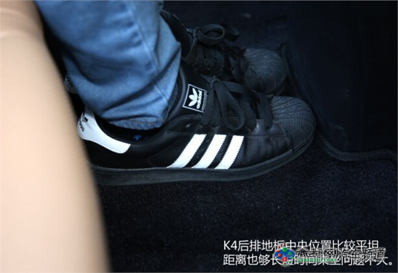 空间方面,身高176cm的体验者坐进前排时,头部空间为四指,不会感到局促。坐进后排时,头部空间仍为四指,腿部空间则达到了两拳以上,翘个二郎腿没有什么问题。值得表扬的是,K4后排地板中央位置比较平坦,距离也够长,坐在中间位置的乘客短时间乘坐的话,舒适性还是可以得到保障的。