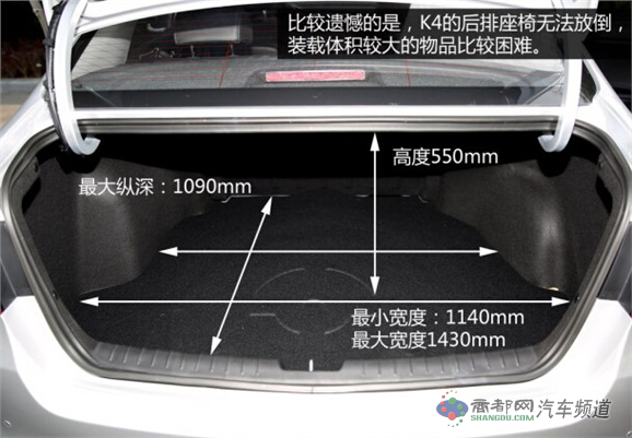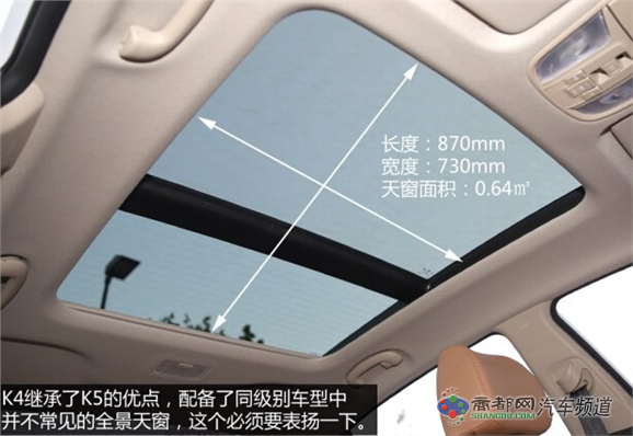 比较遗憾的是,K4的后排座椅无法放倒,车主想要放置体积较大的物品比较困难,建议厂家今后能够改进一下。稍稍让我们感到安慰的是,K4的行李厢空间还算比较宽敞。大尺寸的全景天窗,绝对是个人见人爱的配置,它让车里的每一位乘客都可以享受到温暖的阳光。