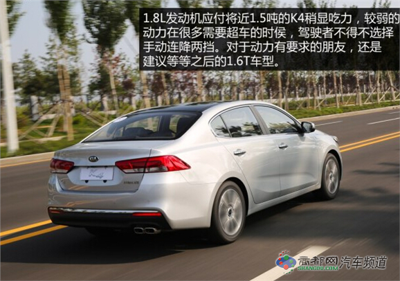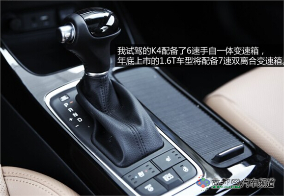即将上市的K4有1.8L和2.0L发动机供消费者选择,据厂家工作人员介绍,年底还将有配备1.6T发动机和7速双离合变速箱的K4上市。我试驾的1.8L车型,最大功率为143马力/6200rpm,最大扭矩为176牛·米/4500rpm;2.0L发动机的最大功率为155马力/6200rpm,最大扭矩为192牛·米/4000rpm。