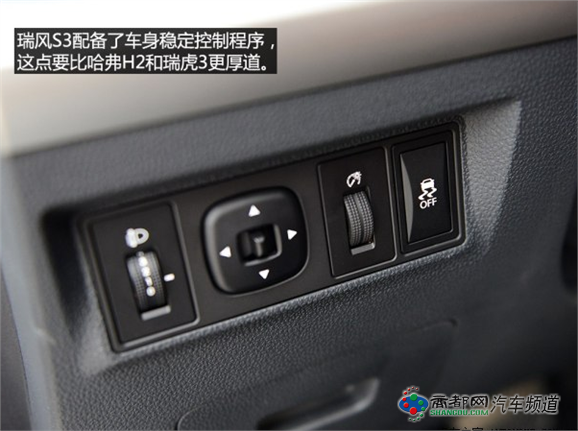 瑞风S3在舒适配置方面和同级别车型差不多,不过在安全配置方面做得很不错。全系除了最低配车型外都配备了车身稳定控制程序,同时还有牵引力控制、刹车辅助、上坡辅助等。