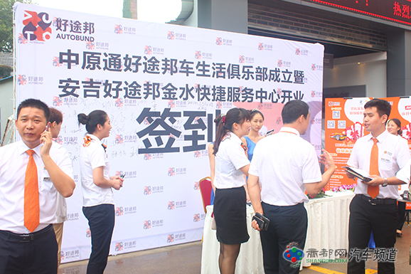 8月30日,中原通好途邦车生活俱乐部成立、上汽安吉好途邦汽车服务系统首家快捷服务中心隆重开业。上汽安吉好途邦管理中心副总经理王德新、直营业务总经理韩伟、区域经理丁继锋、培训督导经理王君耀、河南省汽车行业协会常务副会长蒋贡敏,河南省企业联合会河南省企业家协会副会长兼秘书长郜永军、中国农业银行河南省分行培训中心主任路新胜、郑州市汽车流通协会秘书长王锡建、郑州市汽车修配行业协会秘书长尚青阁、中州国际集团总经理万根,中原通ETC董事长平本强,阳光财险河南分公司副总经理孟庆伟、郑州天荣机动车检测有限公司总经理葛乃兵、黄河科技学院交通学院院长孙同明、河南职业技术学院继续教育学院院长胡锡凤、浦发银行二十一世纪支行行长、河南省自驾游协会等六大车友俱乐部负责人、近30家新闻媒体出席。