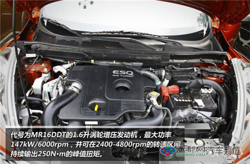 ESQ.6T率动版搭载了一款代号为MR16DDT的1.6升涡轮增压发动机,采用DIG缸内直喷、柔性燃烧控制、CVTCS进排气系统以及低摩擦化等众多先进技术。最大功率147kW/6000rpm,并可在2400-4800rpm的转速区间持续输出250N?m的峰值扭矩。