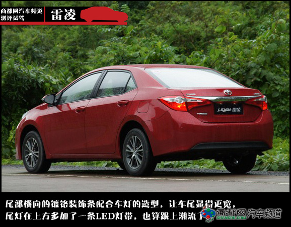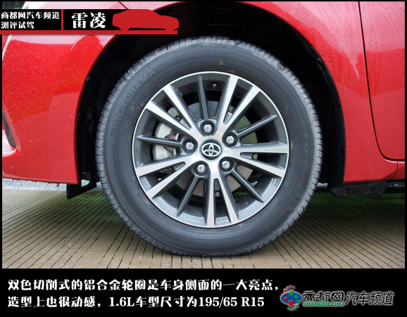 雷凌的1.8L和1.6L车型分别配备205/55R16和195/65R15的轮胎。双色切削式的铝合金轮圈是车身侧面的一大亮点,造型上也富有很强的运动感。