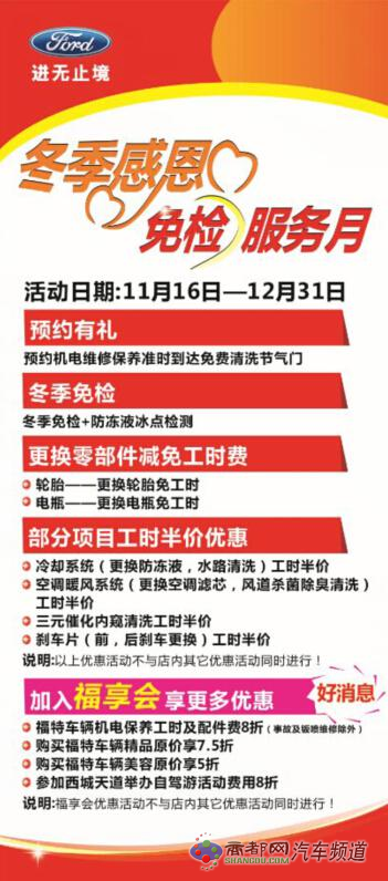 西城天道福特4S店在冬季来临之际,贴心的为你准备了检测保养大餐,免费检测、工时费半价等优惠活动~只等你的到来~