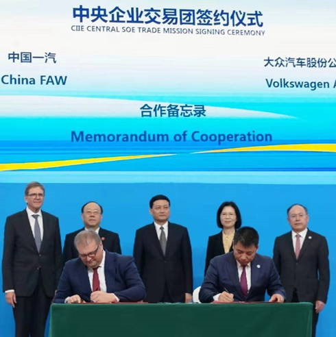 2018年11月6日,在国资委组织的中央企业国际合作论坛上,中国一汽作为第一家论坛签约企业,拉开了本届进口博览会与外商签约的序幕。国资委主任肖亚庆、商务部副部长王炳南、国资委副主任沈莹、中国第一汽车集团有限公司总经理奚国华、大众汽车集团(中国)总裁兼CEO海兹曼教授见证签约,一汽-大众汽车有限公司董事、总经理刘亦功与大众汽车集团(中国)执行副总裁Karsten Schnake作为签约代表,共同签署备忘录。
