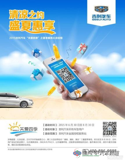 面对高温多雨的恶劣环境,吉利汽车针对刹车片、空调冷媒、雨刮等夏季常用品类进行季节性的促销活动,让你在这个炎炎夏季,劲享超爽清凉让利。