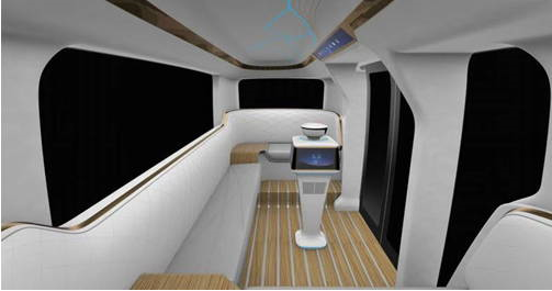 红旗智能小巴的内饰整体简约大方,乳白色菱形缝线座椅配之以玫瑰金电镀饰条温馨而时尚,环抱式座舱提供了优雅的休闲空间,顶部高山绵绵的氛围灯意境满满,精巧的语音交互式机器人是对人工智能的最好诠释。内饰设计将极致中式美学与现代科技做到了完美融合。