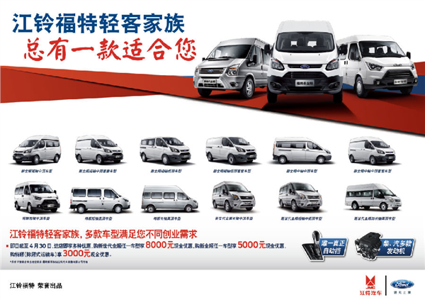 福特轻客家族在购车优惠上,也主动为消费者考虑,即日起至4月30日,购福特新全顺任一车型享5000元现金优惠,购福特新世代全顺任一车型享8000元现金优惠,详情请咨询当地经销商。