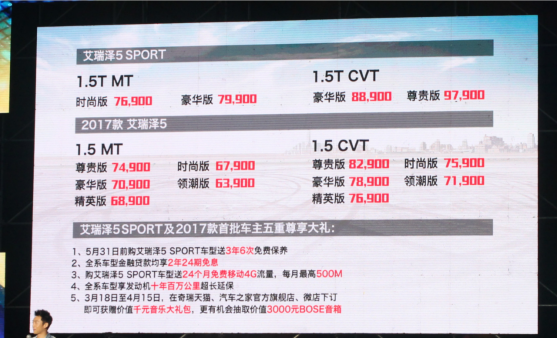 艾瑞泽5 SPORT 形象代言人、新生代实力偶像——“小猎豹”郑恺的现身,引来现场一片沸腾。在主流媒体、车主、跑步爱好者等近万人见证下,郑恺公布了艾瑞泽5 SPORT的价格和首批车主政策。共推出4款车型,售价76,900元到97,900元。