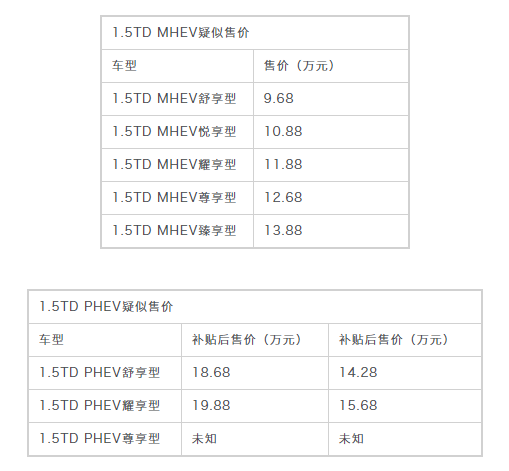 近日,从相关渠道获悉一组吉利星越疑似预售价,1.5TD MHEV版本共推出5款车型,或售9.68-13.88万元;1.5TD PHEV版本车型共推出3款车型,或售18.68万元起。新车预计将于今年第二季度正式上市。