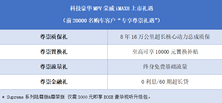 上汽荣威立足高端MPV细分市场发展趋势,为有爱、有为、有向往的国潮新赢家用户量身定制国潮MPV——荣威iMAX8。新车拥有让人一见倾心的“头部网红”高颜值设计、同级唯一的“三魔”配置、充沛的动力和极致舒适的驾乘体验,将以超越主流合资的水准,全方位满足用户对高品质MPV出行的所有需求。