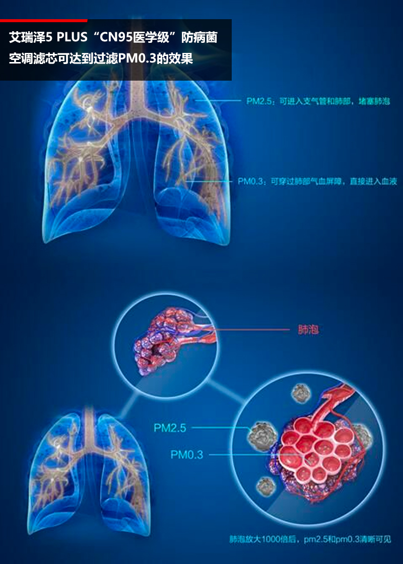 通常我们能见到的空气净化器品牌,如布鲁雅尔、飞利浦、戴森、松下等等,功能点基本都包括用于室内除菌、除甲醛、过滤PM2.5。那么,在车内跟我们息息相关的就是PM2.5,因为你不可能永远都开着内循环,总要打开窗户或空调将外面的空气吹进车内,这里要重点说一下车内PM2.5值,PM2.5被吸入人的体内可堵塞肺泡,使肺功能加重负荷运行,减少肺的寿命。我们通常更多的关注PM2.5,很少注意到还有PM0.3这一指标。实际上,PM0.3是对空气中直径小于或等于0.3微米的固体颗粒或液滴的总称,可穿过肺部气血屏障,直接进入血液,对人体健康影响极大,可以说比PM2.5对于人体的危害性更大,艾瑞泽5 PLUS所采用的“CN95医学级”防病菌空调滤芯,过滤程度可达到过滤PM0.3级别,过滤空气中的污染物能力比很多空气净化器更强。