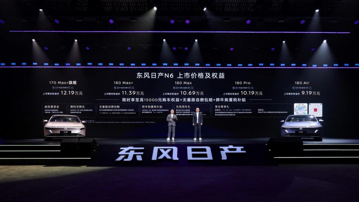 12月1日,以“NI好,插混新势力”为主题的东风日产N6上市发布会在广州举行。东风日产天演架构下的首款插混车型——东风日产N6正式上市。新车定位“大电池超舒适中高级插混轿车”,凭借王牌产品硬实力、越级智能软实力、央企合资高品质三大核心优势,重新定义插混轿车新标准。此次,东风日产N6推出了180Air、180Pro、180Max、180Max+、170Max+旗舰共5个版本,售价区间为9.99-12.99万元。