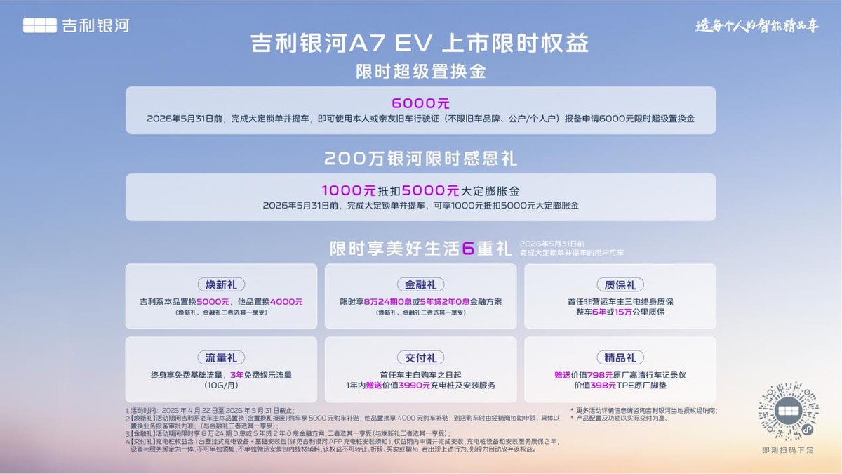 即日起,用户可通过吉利银河APP、微信小程序、抖音小程序及官网等官方渠道下定。凡在2026年5月31日前下定2026款吉利银河A7 EM的用户,可享受5000元超级置换金及1000元抵4000元膨胀金。