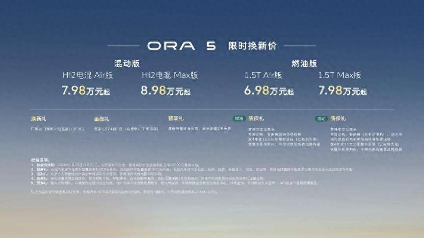4 月 25 日,长城欧拉在第十九届北京国际汽车展览会举办以“求实”为主题的品牌发布会。长城欧拉 5 混动版和长城欧拉 5 燃油版正式上市。其中,欧拉 5 混动版建议零售价 8.98 万元起,欧拉 5 燃油版建议零售价 7.98 万元起。现在下订更可享包含换新礼、金融礼、智联礼、质保礼在内的四重好礼,叠加上市权益后,欧拉 5 混动版限时换新价 7.98 万元起,欧拉 5 燃油版限时换新价 6.98 万元起。