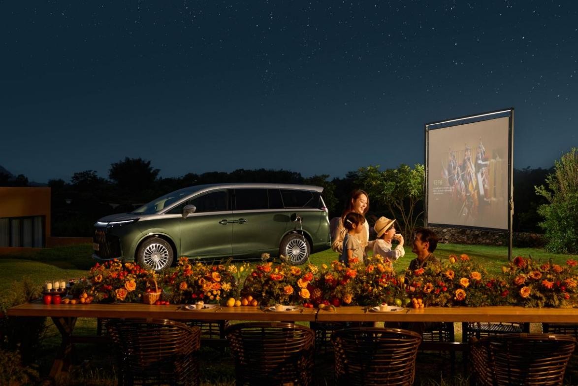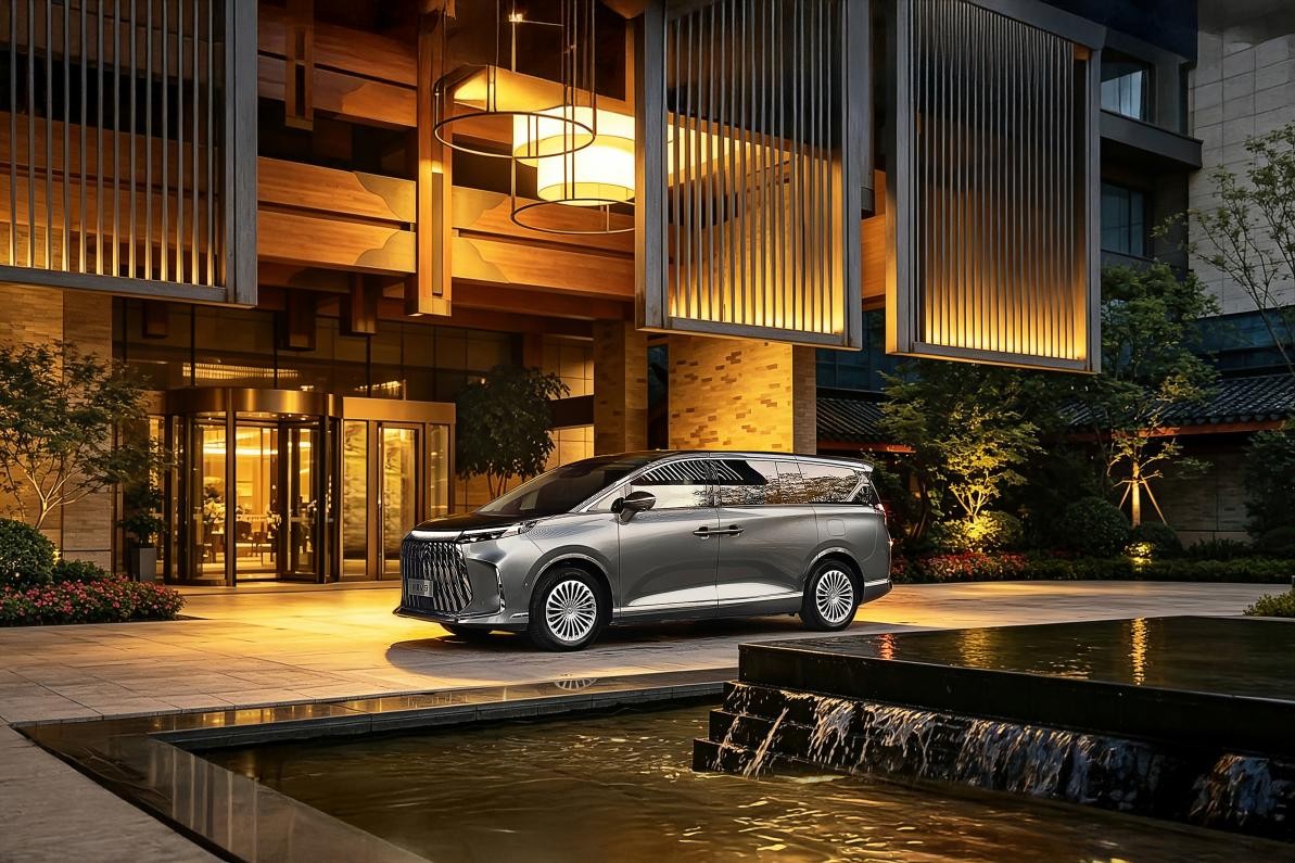前脸点阵化扩散式前格栅未采用同质化封闭设计,既保留了动感视觉张力,又能为增程器提供高效散热,实现美观与实用的平衡;贯穿式星瀑灯带白天呈现雅致哑光质感,夜晚点亮后光线均匀柔和,如星河铺陈,辨识度突出。侧面内嵌式电动侧滑门轨道搭配流畅上扬的腰线,不仅让车身侧面更显干净利落,更助力车辆实现0.29Cd的超低风阻系数。得益于此,车辆高速120km/h行驶时,车内噪音可控制在52分贝,处于同级较低水平,轻声交谈无需刻意提高音量,保障了车内静谧性。